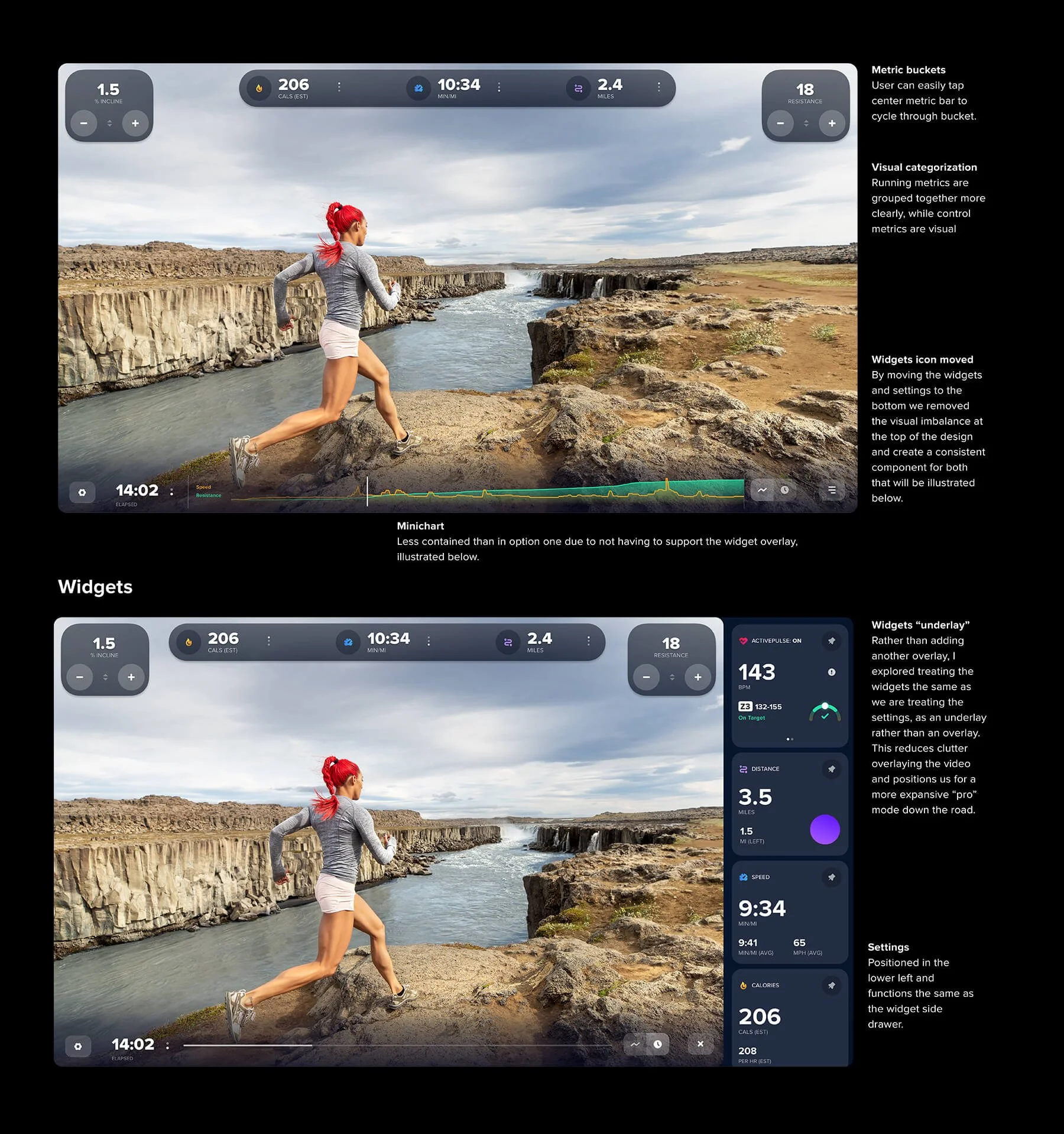 Grouped similar data together (like time, speed, incline), clarified spacing, and tested visual contrast across different video environments. This first concept focused on visual balance and reducing unnecessary noise.
