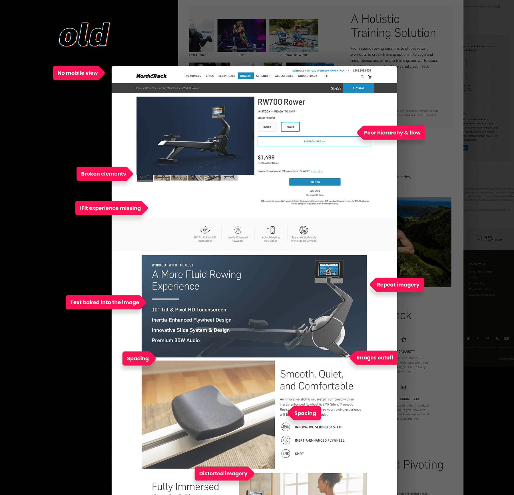 The old PDPs were doing too much and saying too little. Legacy UI patterns, weak CTAs, and inconsistent modules made it hard to compare products or feel confident in the buy. Worse, the experience didn’t match the premium tone set by NordicTrack’s ads and content. There was a serious gap between brand and product.